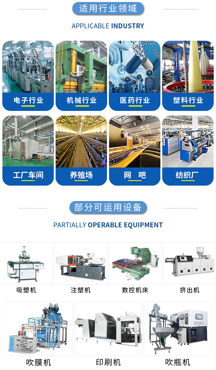 応用分野 工場、デパート、オフィス、プラスチック工業、メッキ工業、食品業、漂白業、化学工業、射出業