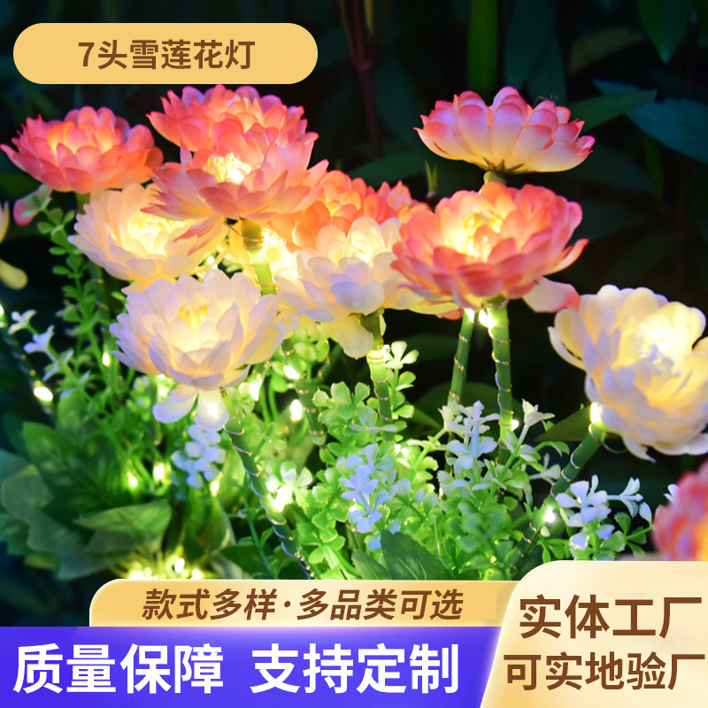 国境を越えて人気の高いソーラー7灯雪蓮ランプ、屋外庭園装飾、芝生用地面設置ランプ、暗くなると自動点灯