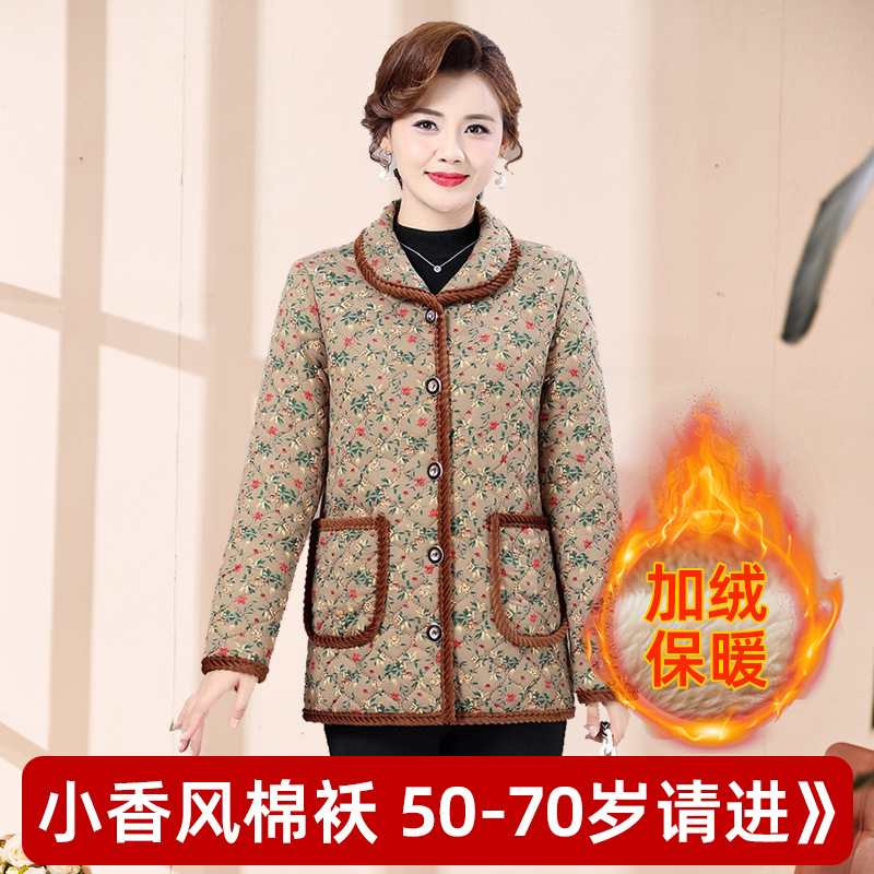 2024冬の綿入れの女性の冬のお母さんはベルベットを着て保温カバーの女性のコートの中高年プリントの綿入れを厚くした