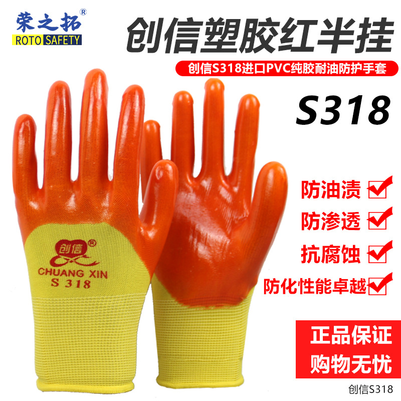 メーカー直販ゴム耐久性耐油酸アルカリ防護手袋創信s318pvc手袋浸ゴム労働保護手袋