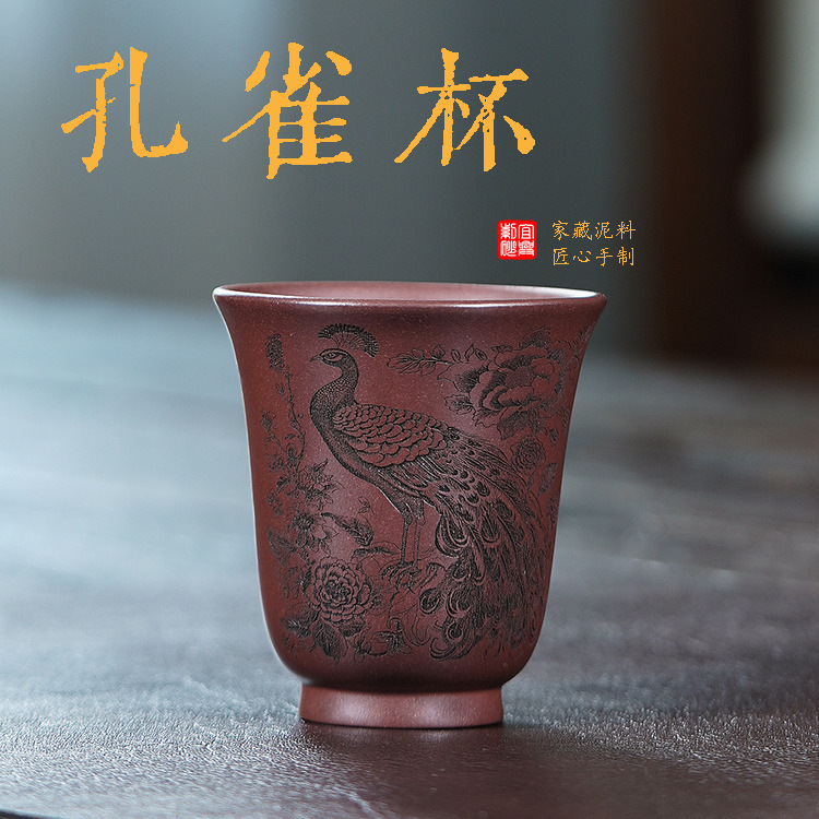 壺芝宴宜興紫砂孔雀杯手作り彫刻カップ主人杯家庭用シングルカップ手作り