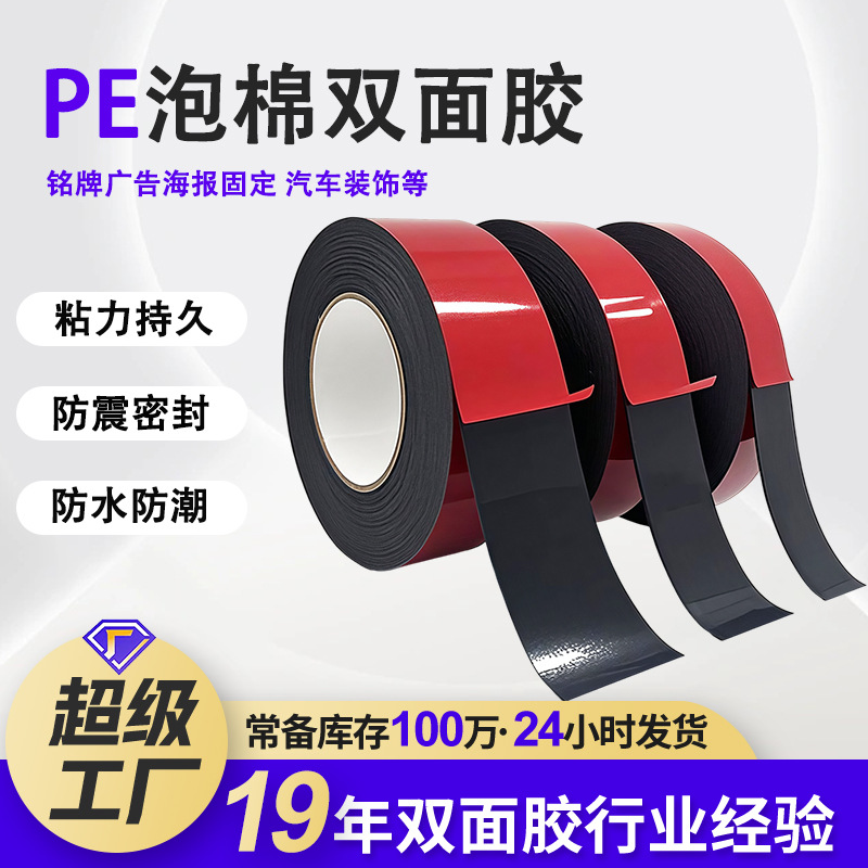 PE泡棉双面胶:是以高密度电子发泡泡棉为基材,在其一面或两面涂上亚克力胶水,再经高温烘烤后覆以离