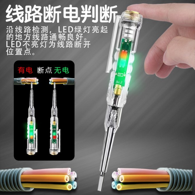 1、笔头感应或探测到电压时,笔头的白色处会发光并蜂鸣,很容易就可探测到火线,并知道哪条线存在危险电压。
