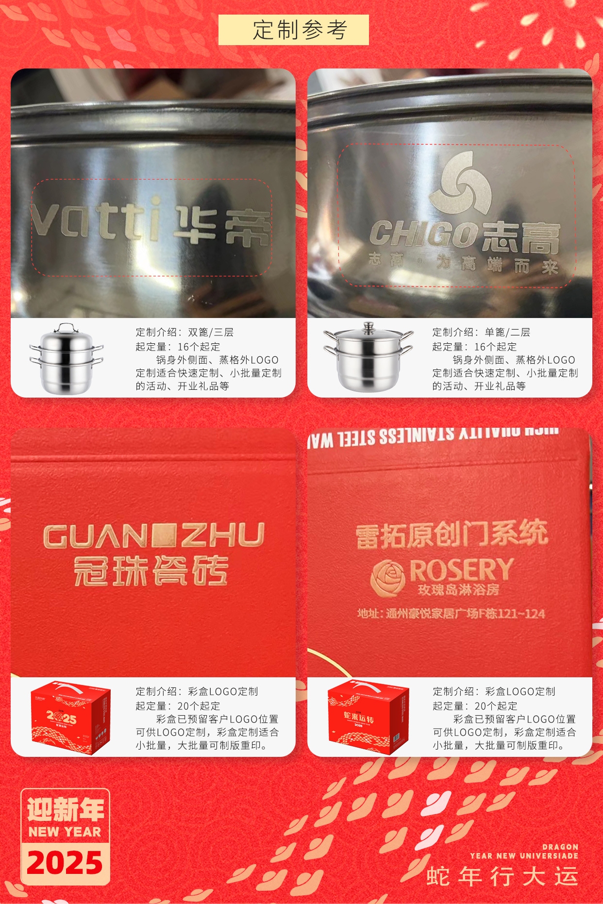 支持定制:厚款锅身16套起支持激光打标定制,彩盒激光印logo16个起支持加印详细咨询客服