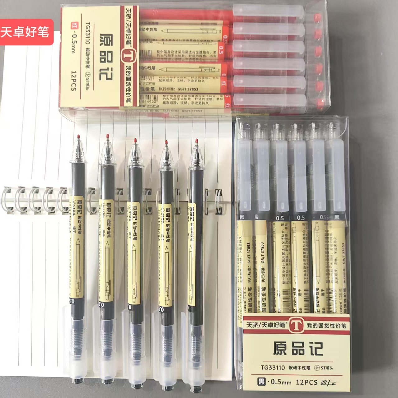 天卓原品記33110押し中性ペン黒赤0.5速乾水筆シンプルファッションブラシ書き