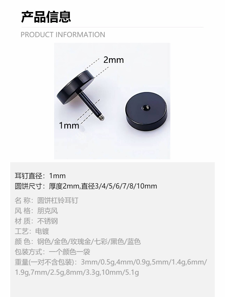 不锈钢螺纹纽扣两头圆形圆饼杠铃饰品耳钉哑铃工字耳环耳饰