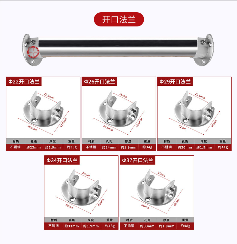 304不锈钢圆管开口法兰座高脚法兰衣柜衣管托挂衣杆底座毛巾杆座