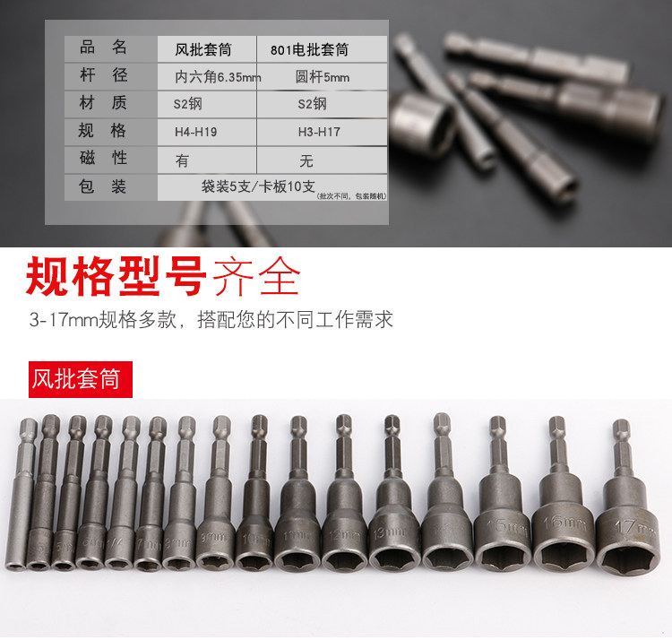 強磁801内六角スリーブ延長風砲風ロットヘッドねじ懐中電灯ドリル電動スパナソケットロット5mm