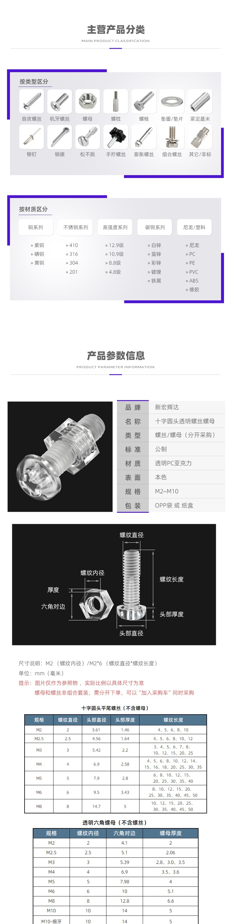 PC透明ネジ・ナット、プラスチックネジ・ナット、樹脂ネジ・ナット、透明六角ナット、透明十字ネジ、アクリルネジ・ナット