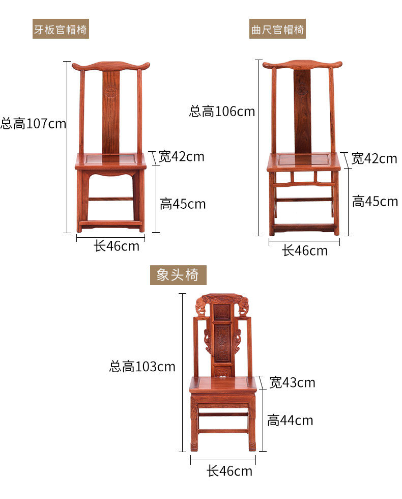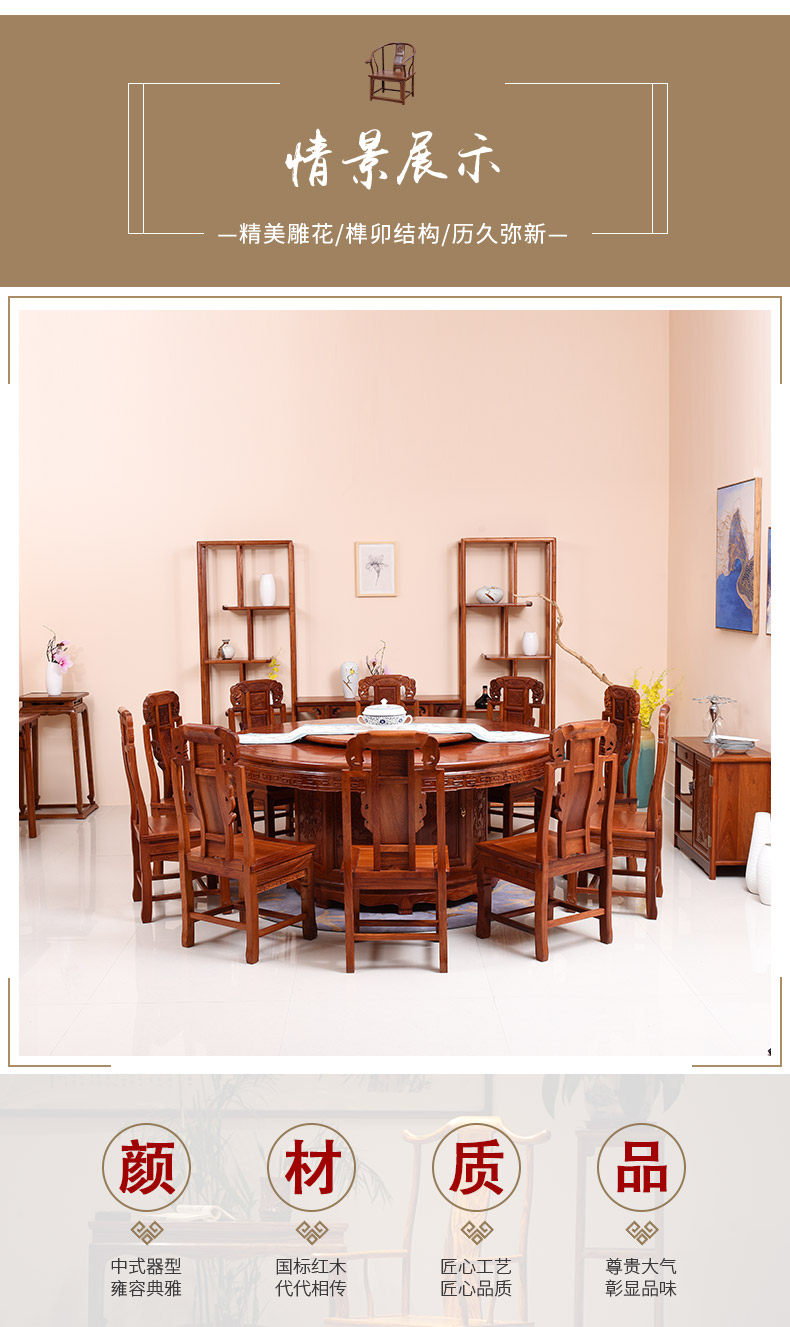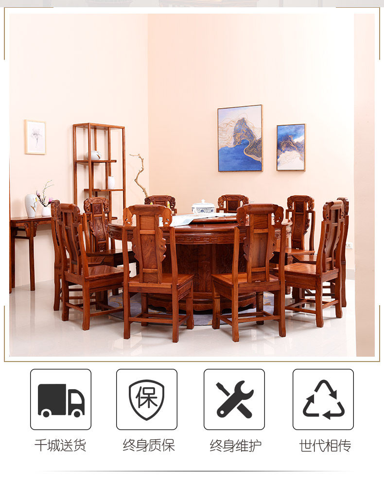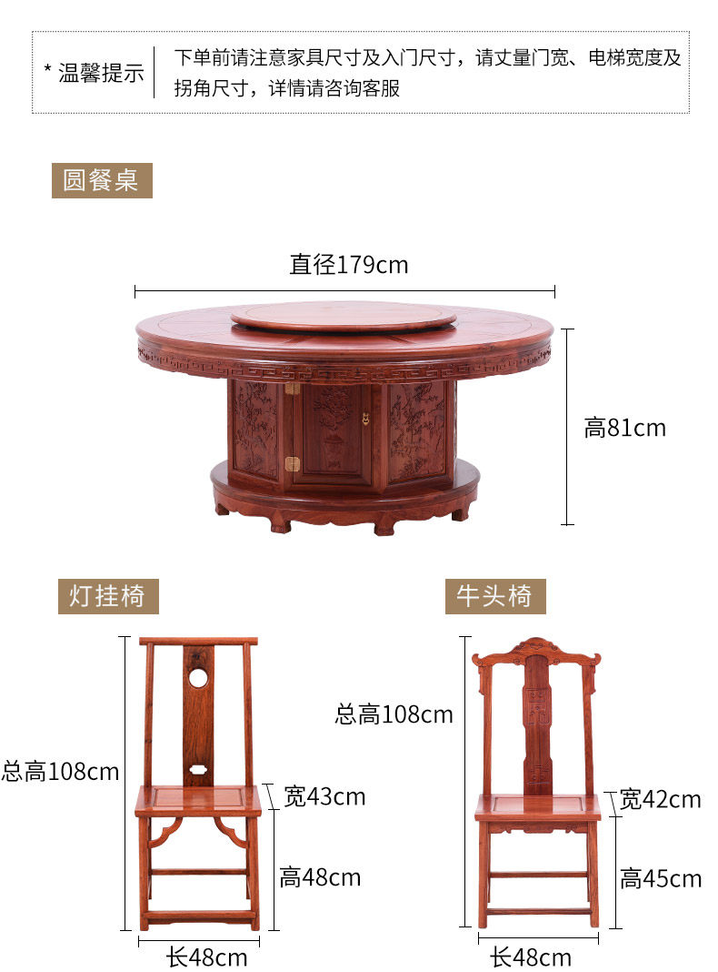 【商品尺寸】 | 圆餐桌:直径179*高81cm 牛头椅:长48*宽42*坐高45(总高108)cm 象头椅:长46*宽43*坐高44(总高103)cm 灯挂椅:长48*宽43*坐高48(总高108)cm 曲尺官帽椅:长46*宽42*坐高45(总高106)cm 牙板官帽椅:长46*宽42*坐高45(总高107)cm (手工测量拍照,存在0-3cm误差属于正常现象,介意请慎拍) | ||