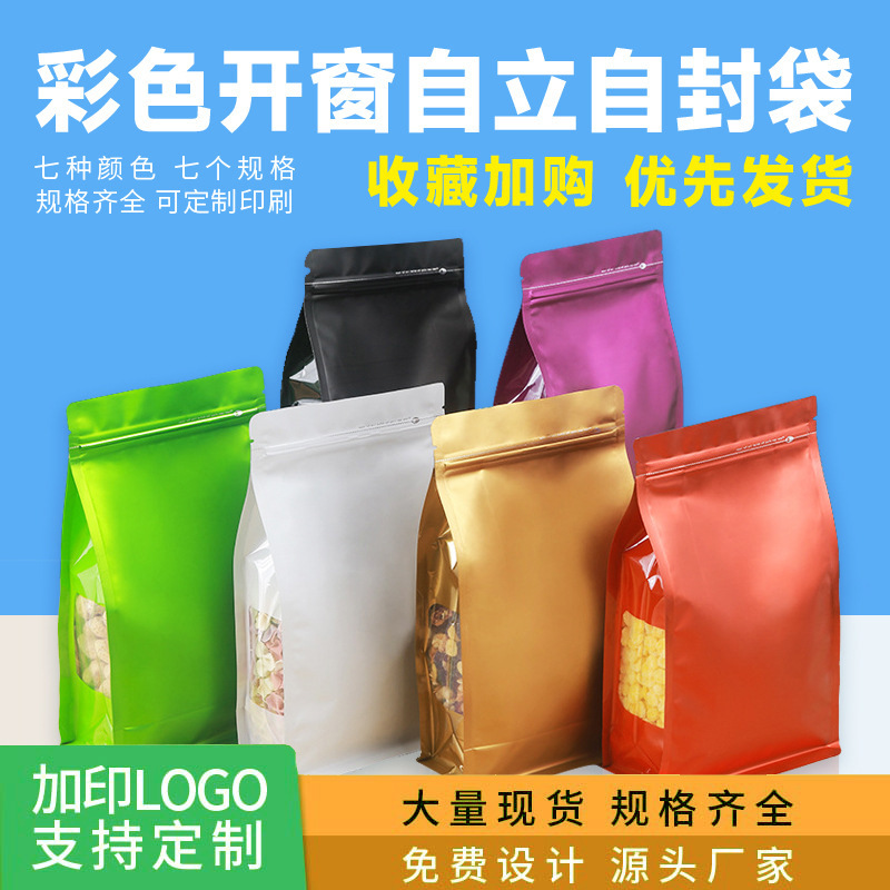 カラフルな8面シールサイドオープンウィンドウ自立スナックバッグドッグフードドライフルーツスポット増粘アルミホイルフードティージップロックバッグ