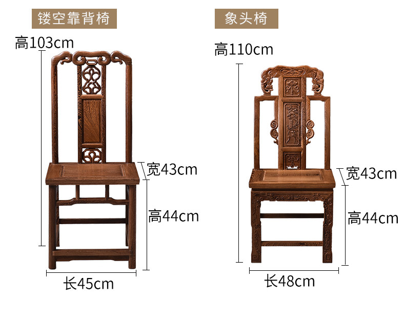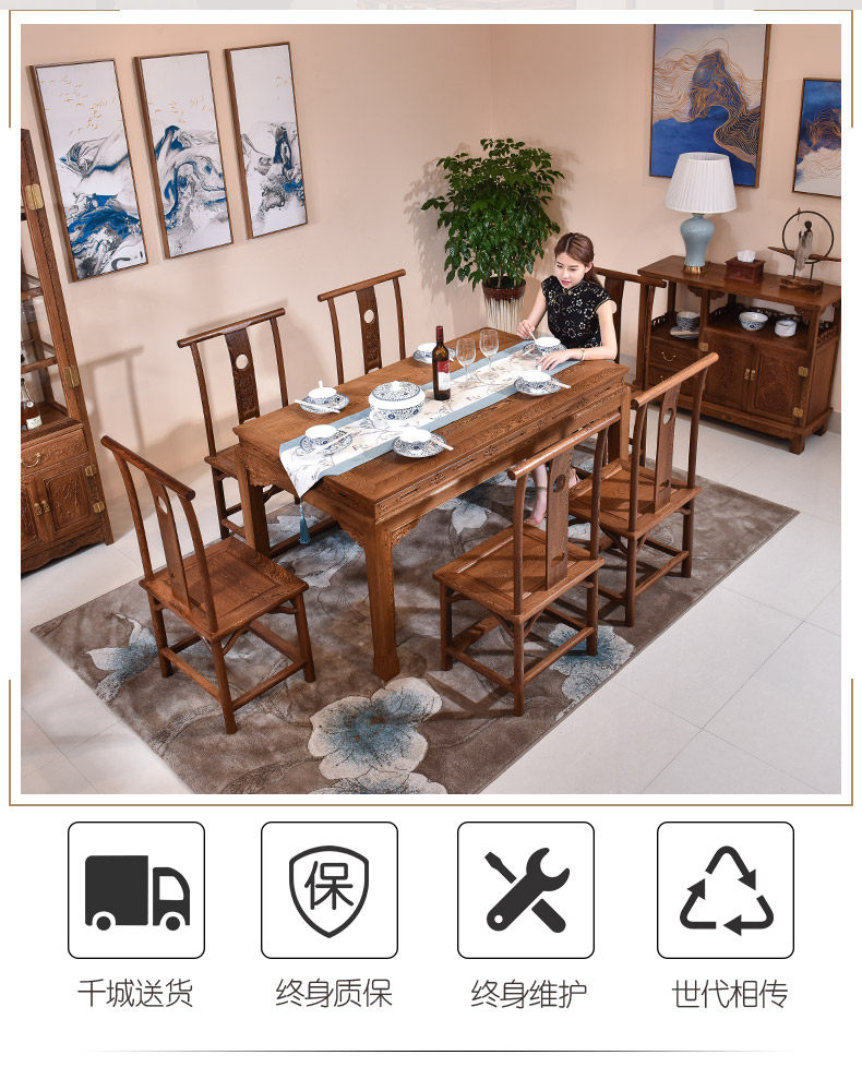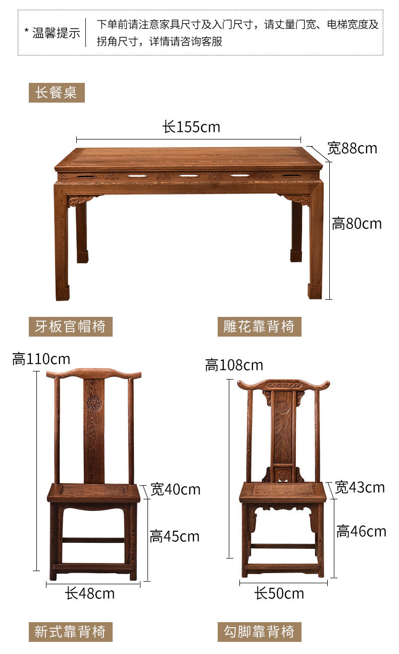 【商品尺寸】 | 餐桌:长155*宽88*高80cm 雕花靠背椅:长50*宽43*坐高46cm(总高108)cm 勾脚靠背椅:长45*宽40*坐高43(总高100)cm 灯挂椅:长50*宽42*坐高45(总高103)cm 镂空靠背椅:长45*宽43*坐高44(103)cm 牙板官帽椅:长48*宽40*坐高45(总高110)cm 新式靠背椅:长45*宽44*坐高44(总高102)cm 曲尺官帽椅:长48*宽42*坐高45(108)cm 象头椅:长48*宽43*坐高44(110)cm (手工测量拍照,存在0-3cm误差属于正常现象,介意请慎拍)