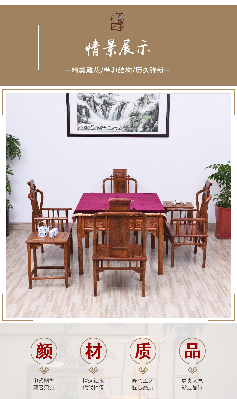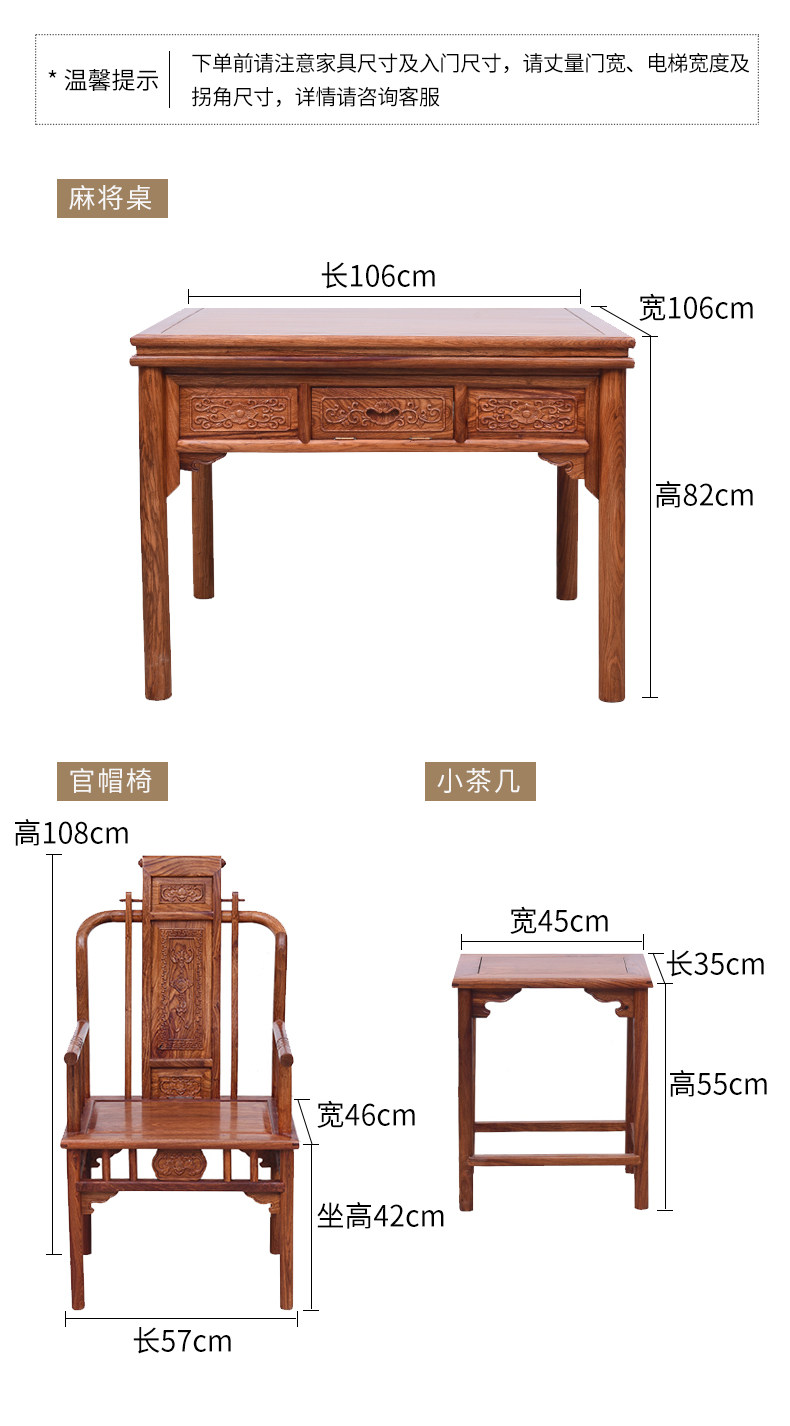 【商品尺寸】 | 麻将桌:长106*宽106*高82cm 官帽椅:长57*宽46*高108(座高42)cm 小茶几:长35*宽45*高55cm (手工测量拍照,存在0-3cm误差属于正常现象,介意请慎拍) | ||