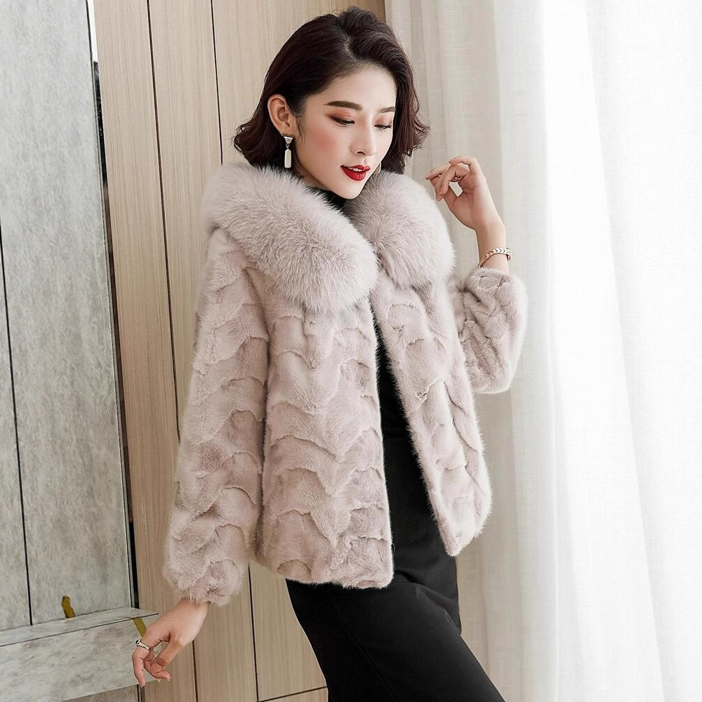 2025秋冬新款水貂皮草短款女狐狸毛领貂皮 大衣海宁拼貂毛皮气质