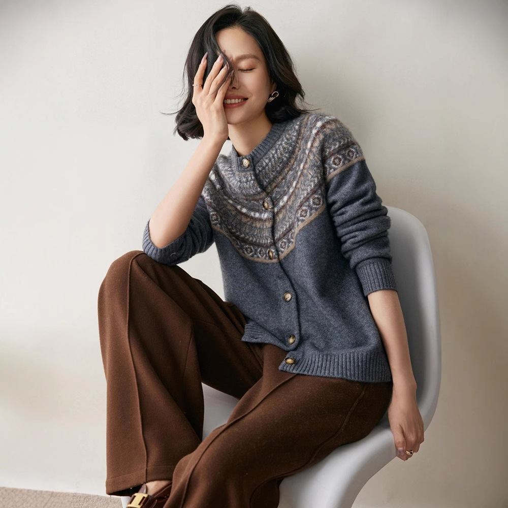 浪漫主义~高级感山羊绒开衫女圆领撞色费尔岛提花图案毛衣外套女