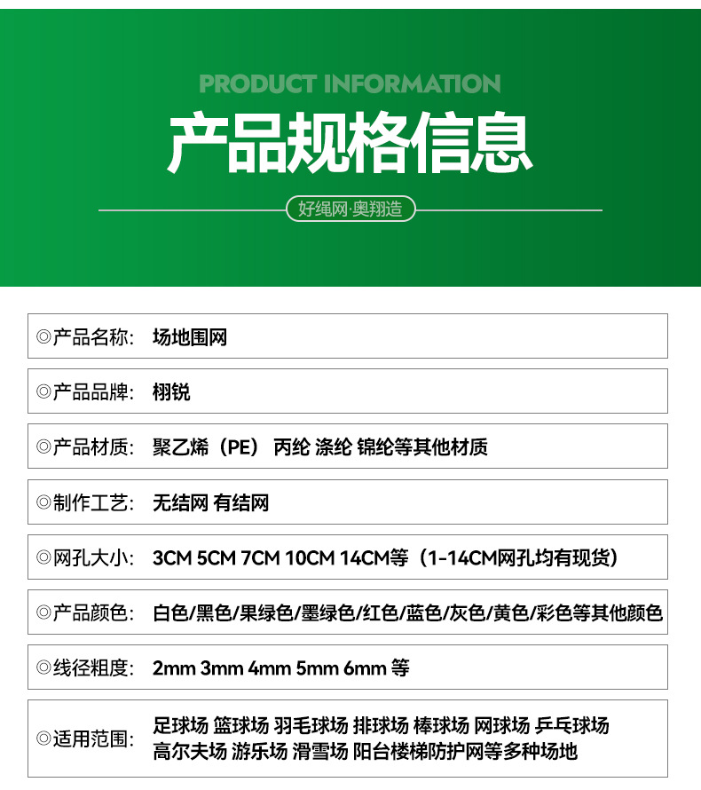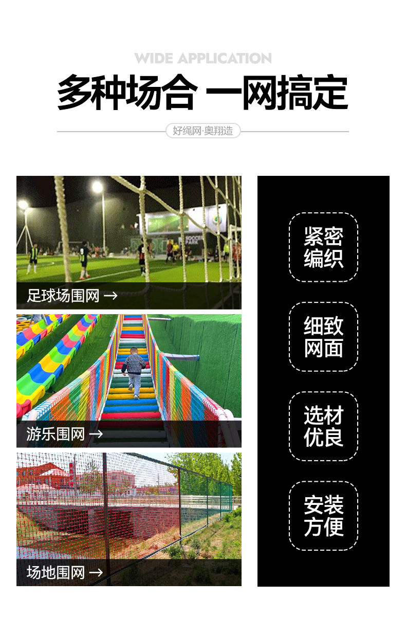 用途範囲 各種スポーツ会場フェンスネット、トップネット、隔離ネット、遊園地バルコニー階段安全保護ネット