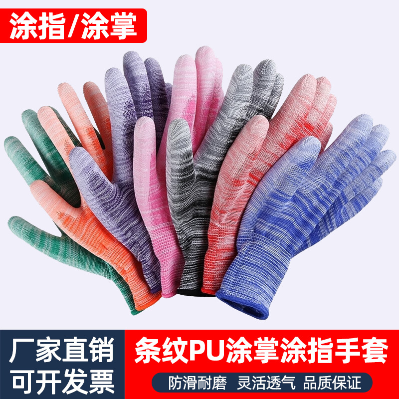 卸売ナイロンpu指涂り手袋ストライプ涂り手のひら静電防止男女作業コーティング電子工場保護手袋
