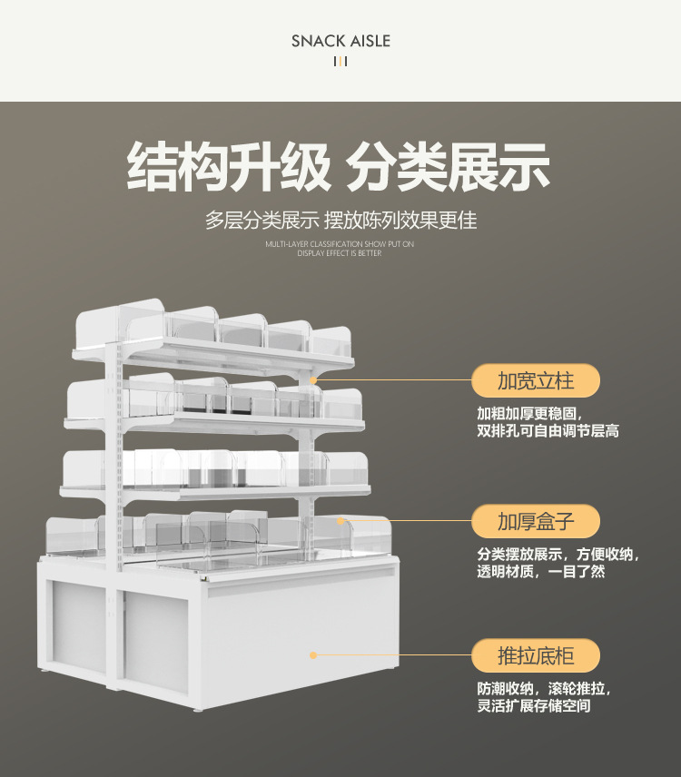 零食货架便利店透明带底柜单双层散称零食展示架可组装商超货架