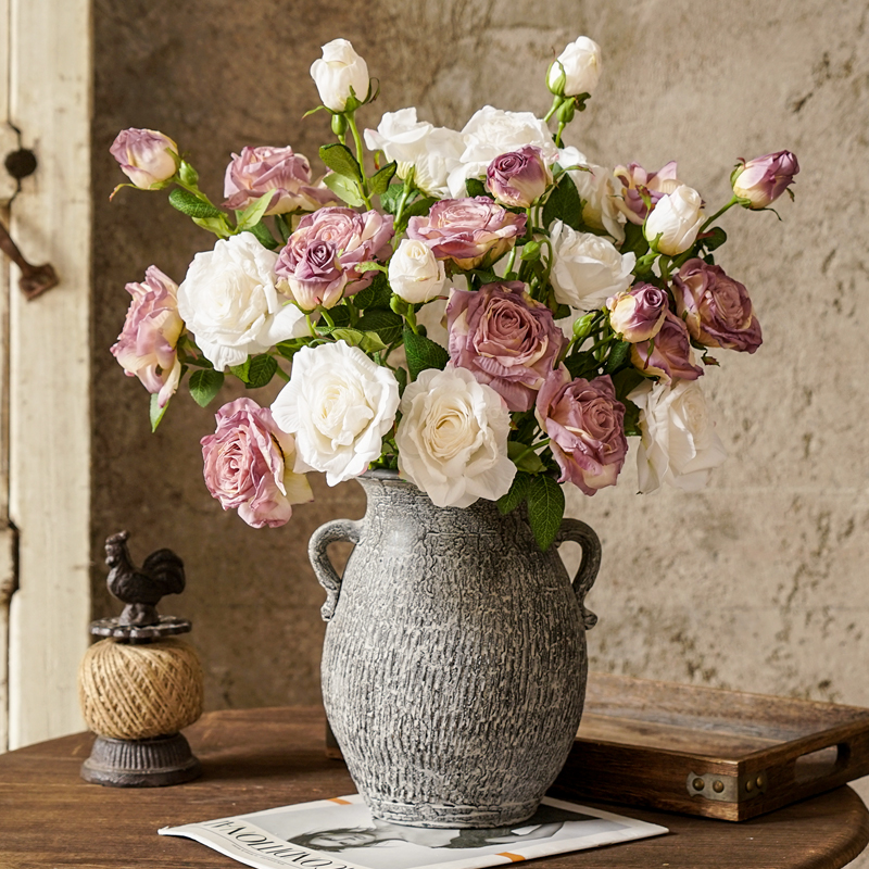 高档复古焦边玫瑰花仿真花客厅餐桌装饰插花干花摆设玫瑰假花摆件