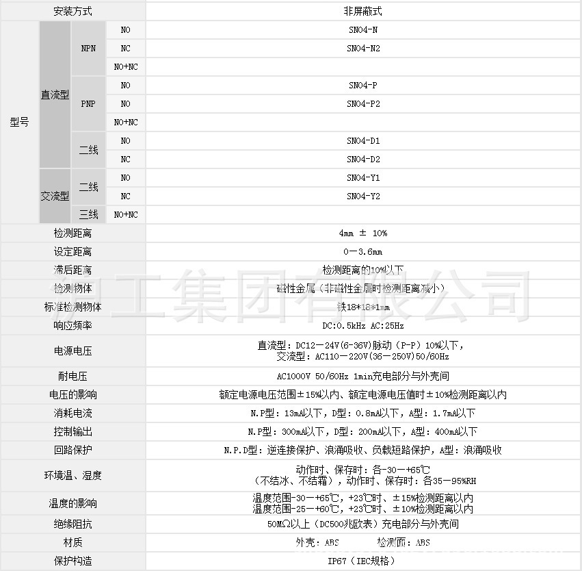 型番 SN04-N直流三線ぜんまい,SN04-N2直流三線npn常閉,SN04-P直流三線pnp常開,SN04-P2直流三線pnp常閉,SN04-D直流二線常開,SN04-D2直流二線常閉,SN04-Y1交流二線常開,SN04-Y2交流二線常閉