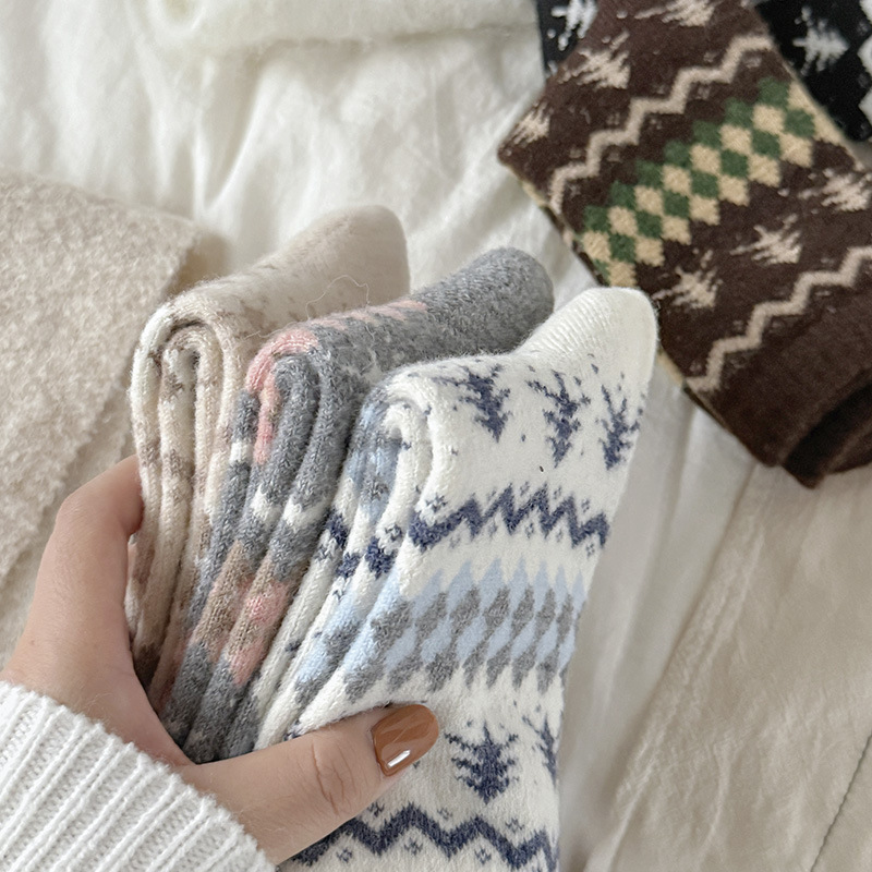 羊毛费尔岛袜子女中筒袜秋冬款加厚加绒保暖羊绒日系复古冬天长袜