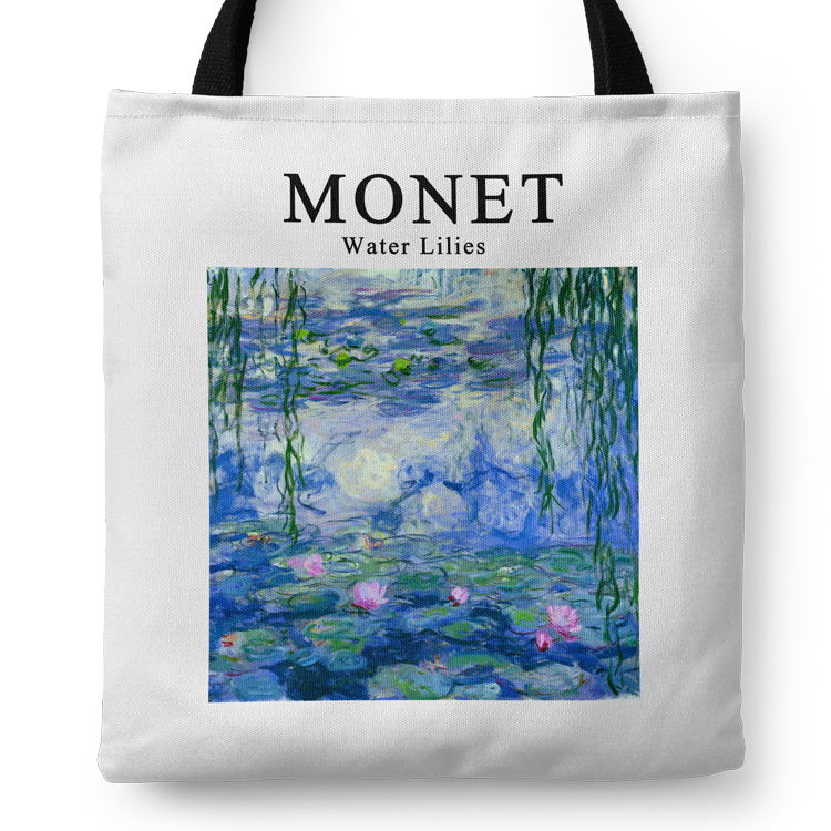 モネのしだれ柳のスイレンのキャンバスの布はショッピングバッグの手提げ袋のショルダーバッグのマミーバッグを包んで図に来てロゴを加えます。