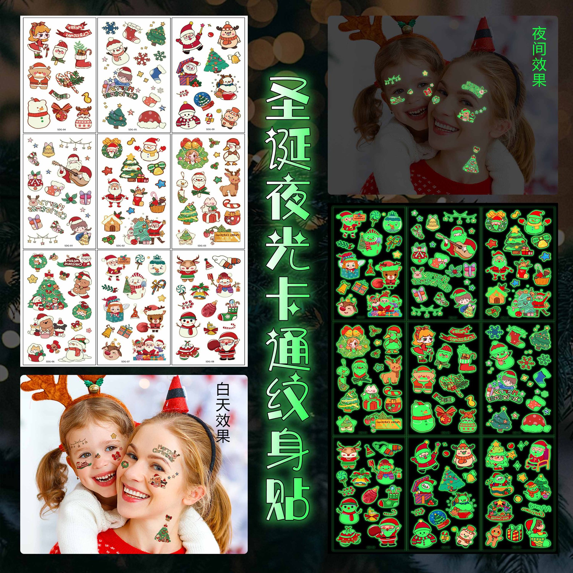 個性的なクリスマスの夜の光の刺青は子供の漫画のアイデアの臨時の刺青を貼って祝日の集まりの発光の刺青を貼って貼ります。