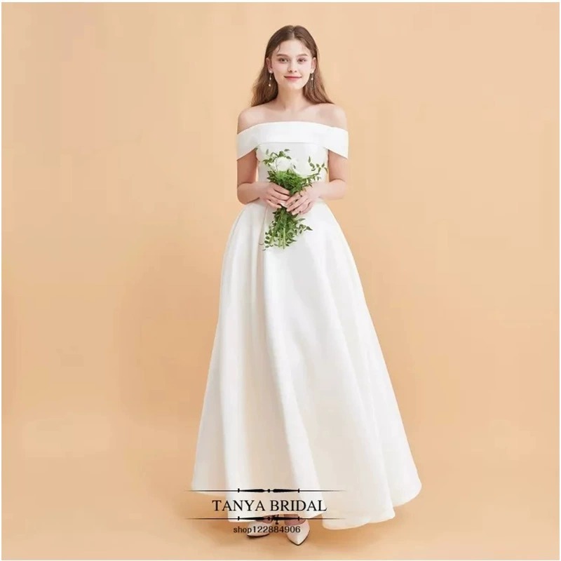 ウェディングドレス ワンショルダー サテン シンプル ヘップバーン風 小柄さん向け 2025年秋新作 ショート丈 旅行撮影用 結婚式ドレス