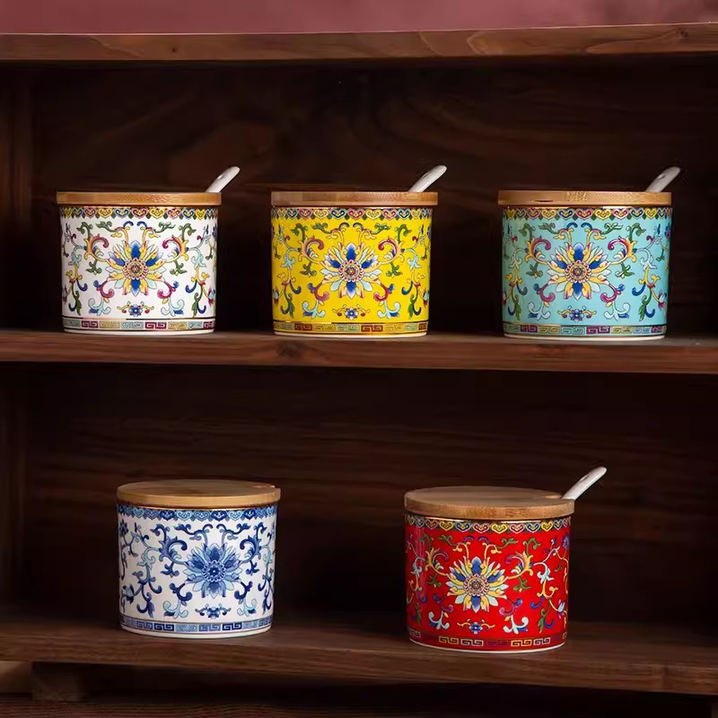 エナメル新中国式調味缶景徳鎮陶磁器塩缶収納缶唐辛子麺缶砂糖缶酢缶蓋付き