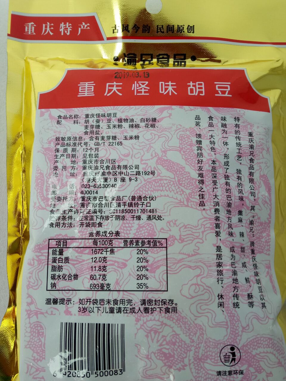 重慶特産渝兄食品200g重慶怪味胡豆スナック卸売り