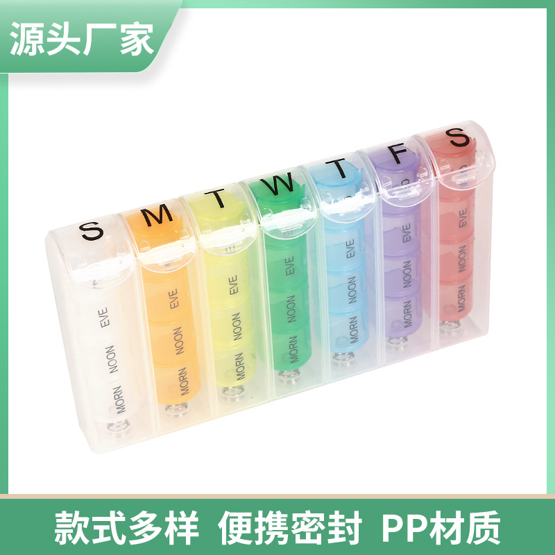 クロスボーダー電気商カラー一週間薬箱七彩28格虹薬箱7日間旅行バネ式携帯薬箱