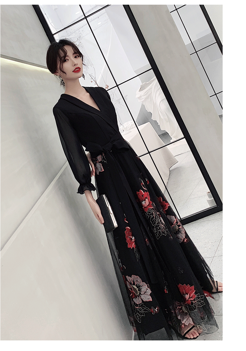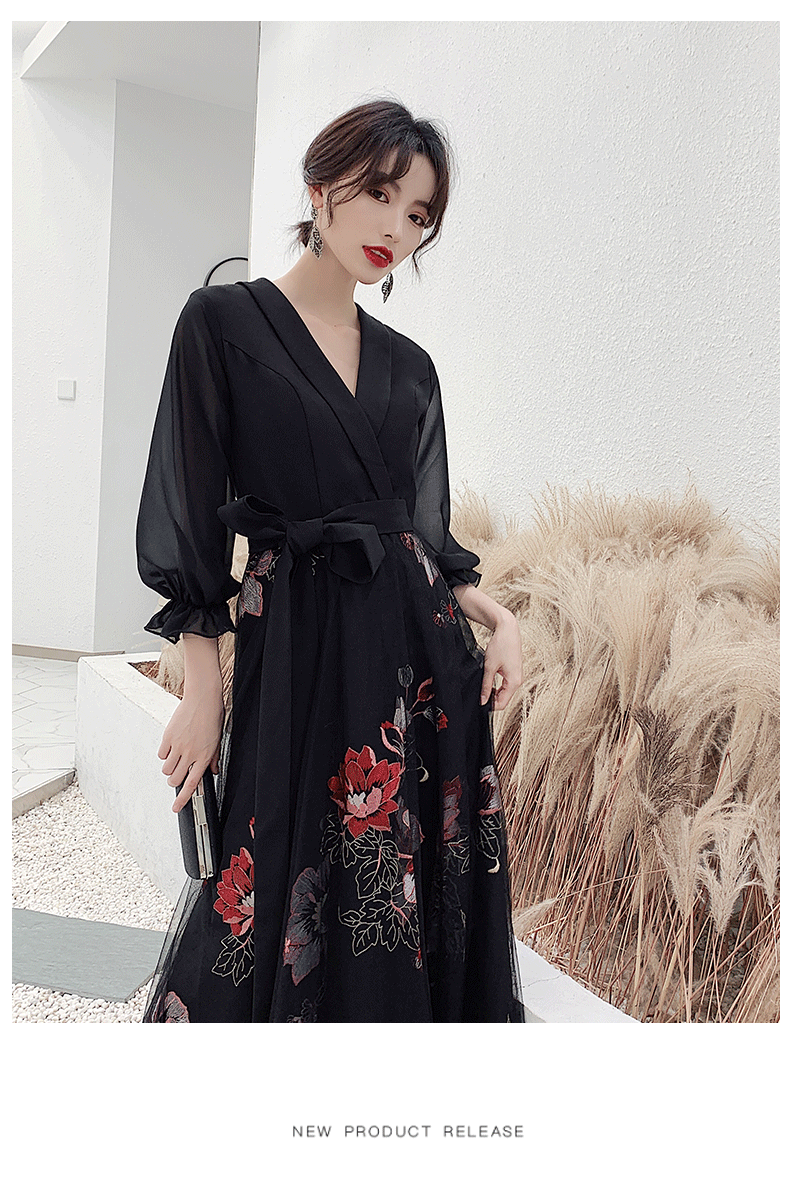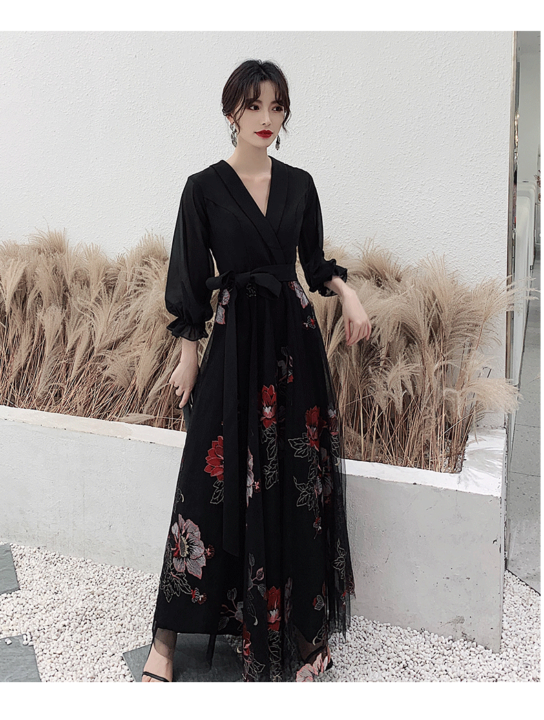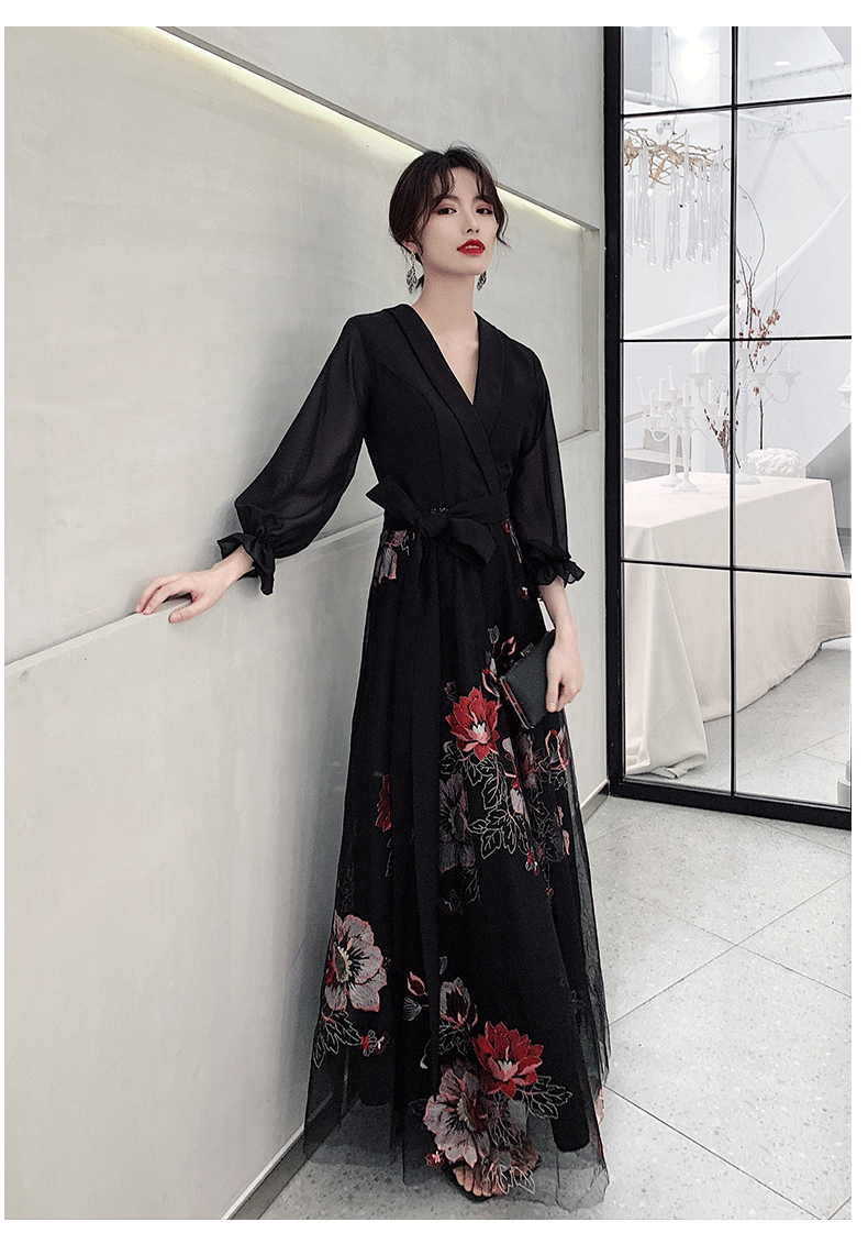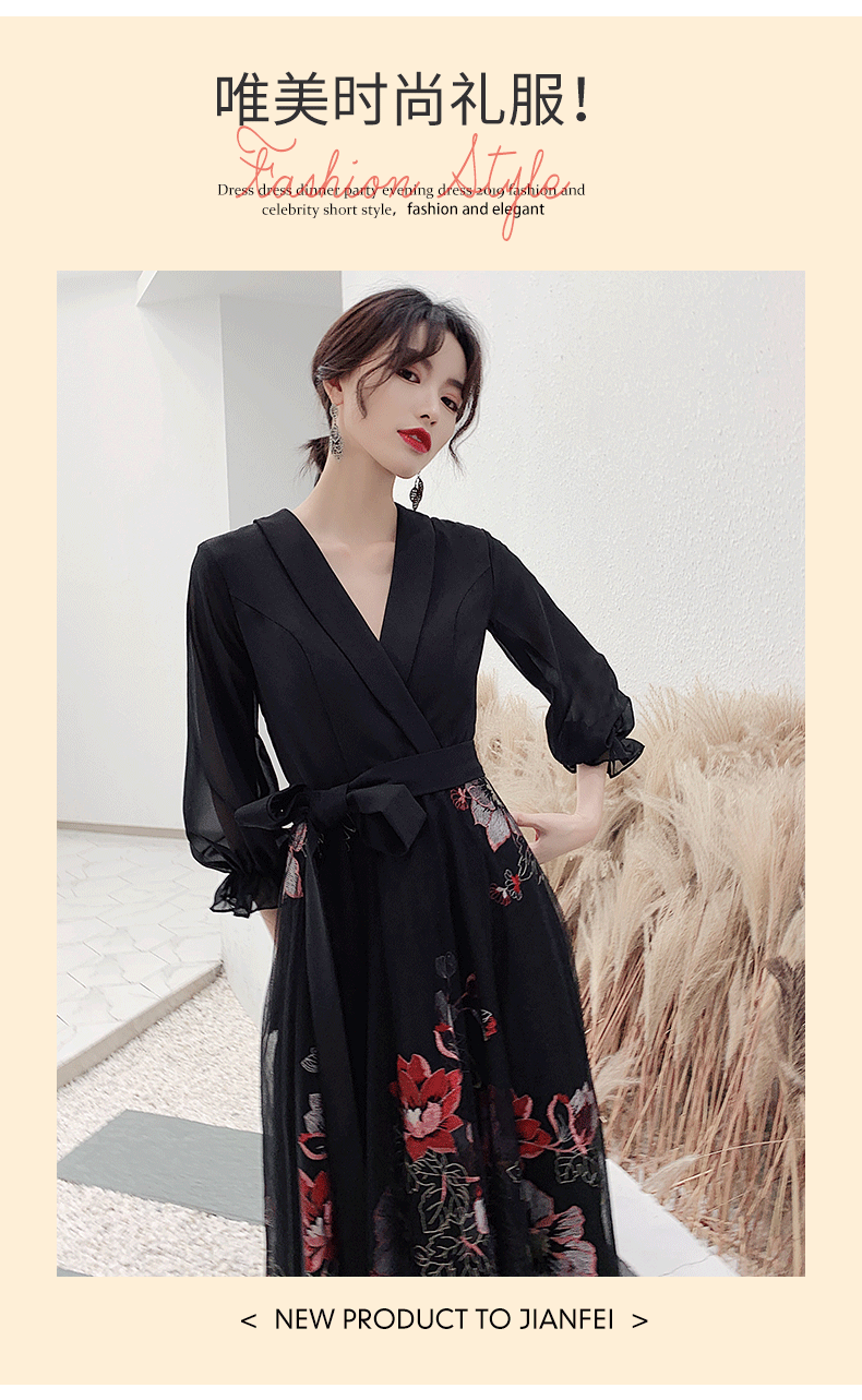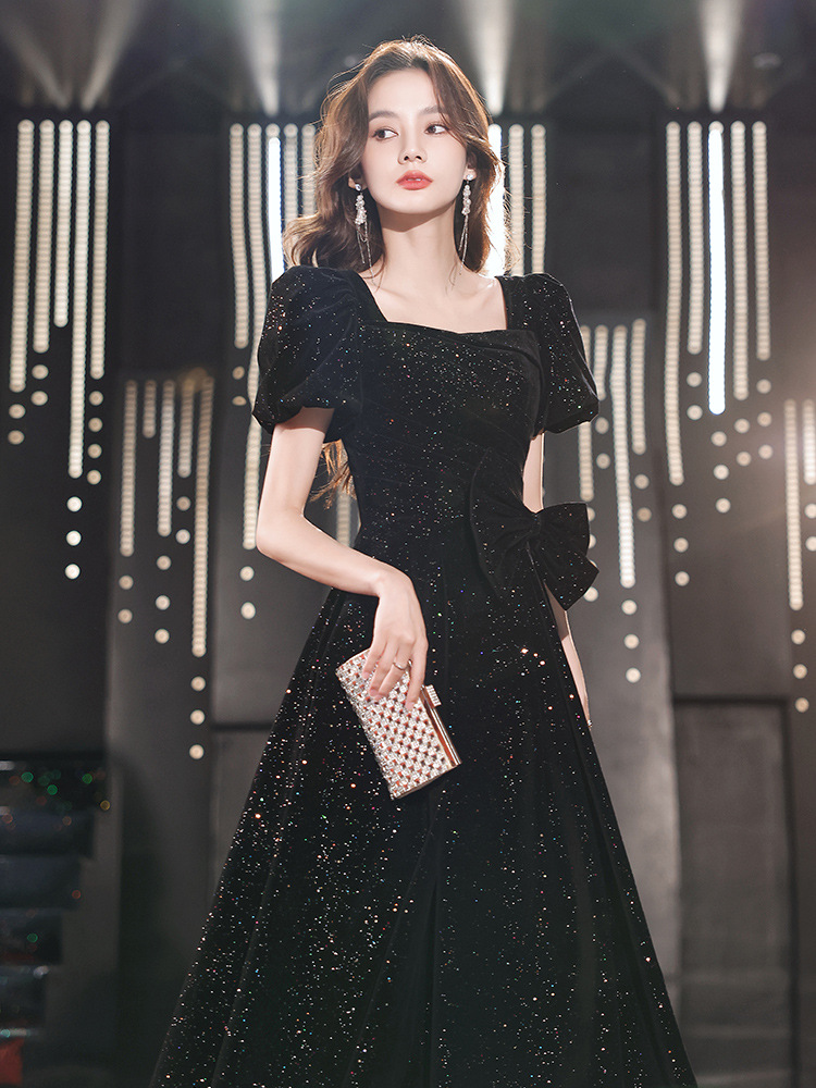 黒の宴会用ドレス2025新作、上品なフレンチスタイルの司会者用衣装、質感のあるロングイブニングドレス