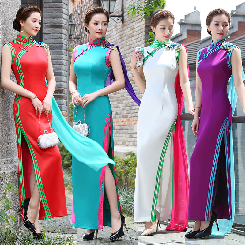 2020年春夏新作ロングチャイナドレス、おしゃれな中高年向け舞台衣装、キャットウォーク、宴会、式典用チャイナドレス