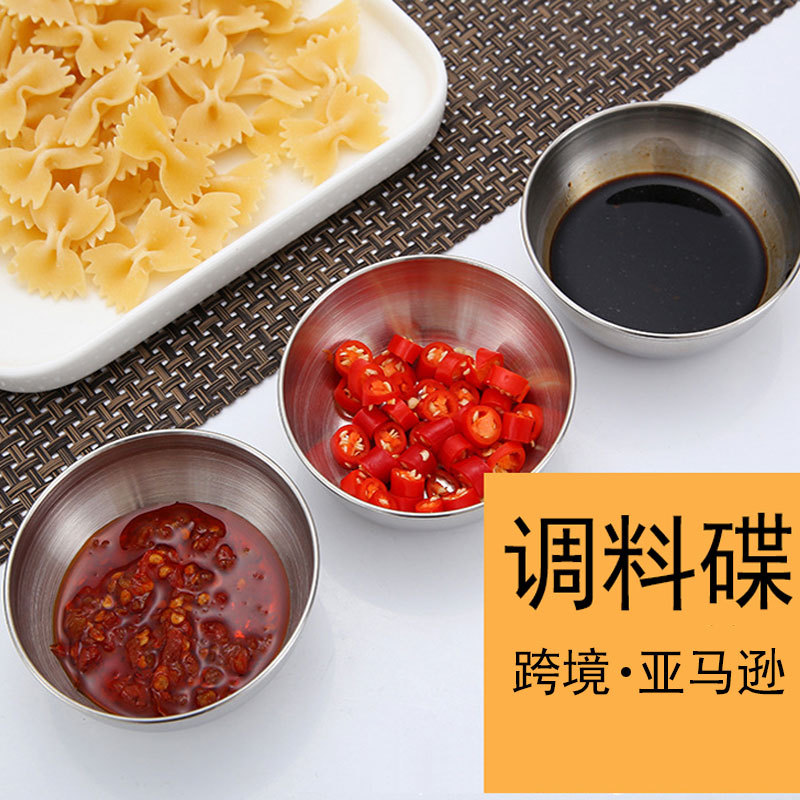 国境を越えたステンレスの円形に皿をつけて、家庭用の醤油酢皿の軽食皿で調味した調味料寿司をボウルにつけます。