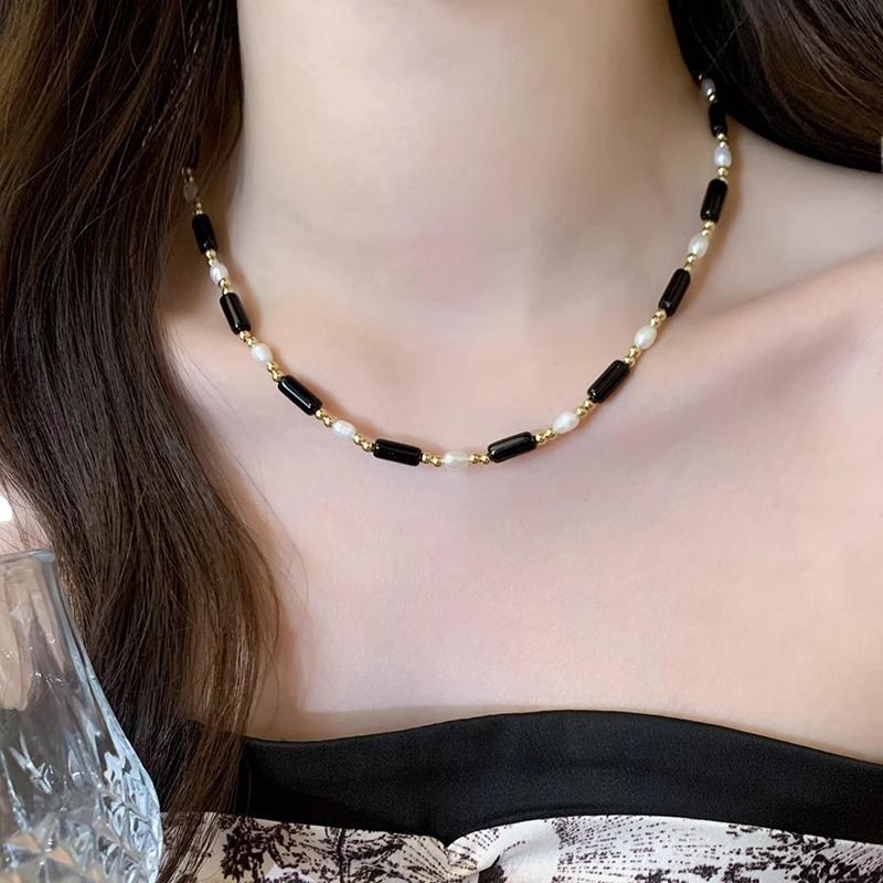 米粒淡水真珠の長い黒い瑪瑙のネックレスの女性の軽くて豪華で冷たい風の小さい大衆の鎖の骨の鎖の白黒は色の首の鎖にぶつかります。