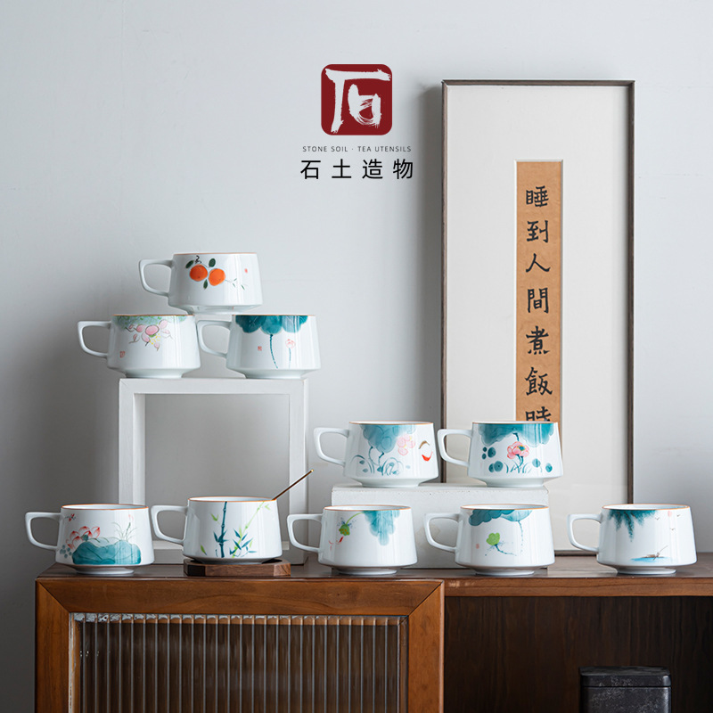 国潮陶磁器釉薬下彩手描きハスの花コーヒーカップマグカップ家庭用中国式オフィスカップ水筒子供