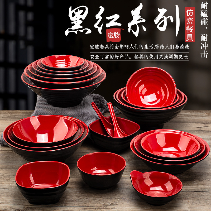 黒赤メラミン麺館専用碗は磁器の食器のラーメンの碗の麻辣热碗の酸っぱい粉の碗のホテルのご飯の小さい碗に似せます。