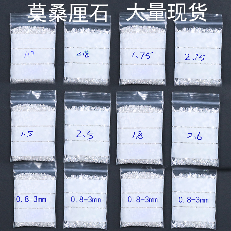0.8mm(1カラットあたり約340粒),0.9mm(1カラットあたり約250粒),1.0mm(1カラットあたり約200粒),1.1mm(1カラットあたり約170粒),1.2mm(1カラットあたり約125粒),1.3mm(1カラットあたり約100粒),1.4mm(1カラットあたり約85粒),1.5mm(1カラットあたり約70粒),1.6mm(1カラットあたり約60粒),1.7mm(1カラットあたり約50粒),1.8mm(1カラットあたり約40粒),1.9mm(1カラットあたり約37粒),2.0mm(1カラットあたり約35粒),2.1mm(1カラットあたり約30粒),2.2mm(1カラットあたり約25粒),2.3mm(1カラットあたり約22粒),2.4mm(1カラットあたり約20粒),2.5mm(1カラットあたり約17粒),2.6mm(1カラットあたり約16粒),2.7mm(1カラットあたり約15粒),2.8mm(1カラットあたり約13粒),2.9mm(1カラットあたり約11粒),3mm(1カラットあたり10粒)
