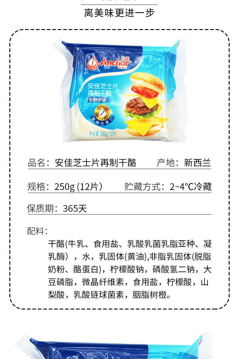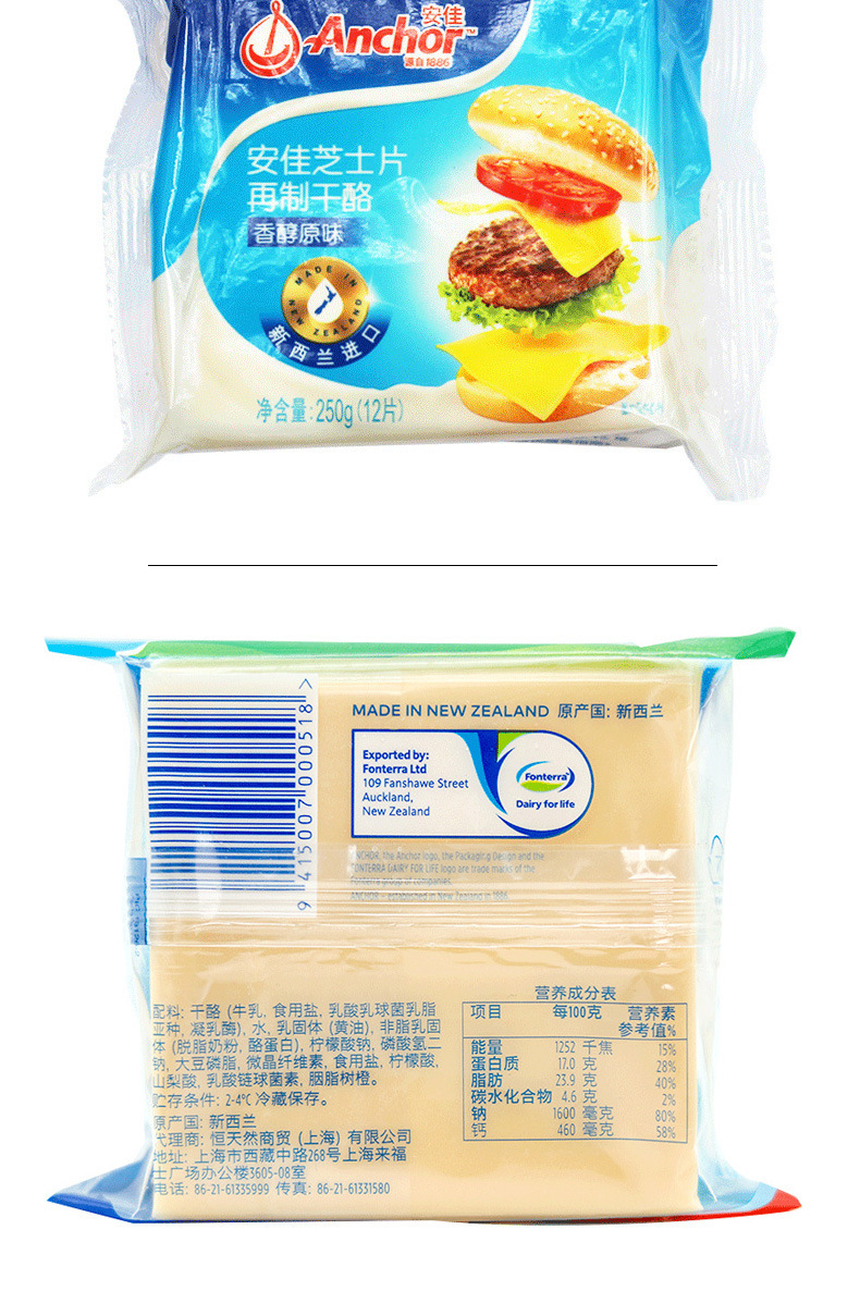 安佳チーズ片250g * 24パック/箱12枚入インスタントチーズスライスハンバーグサンドイッチチーズチーズ