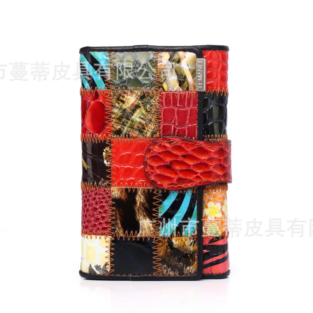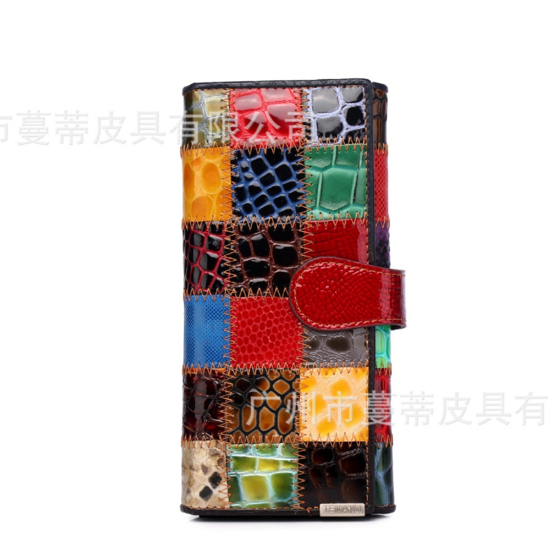 女性の字の刺繍の3つ折は本革の財布の長いタイプの牛革の復古のカラーの財布の越境の携帯電話の箱のシリーズをつなぎ合わせます。