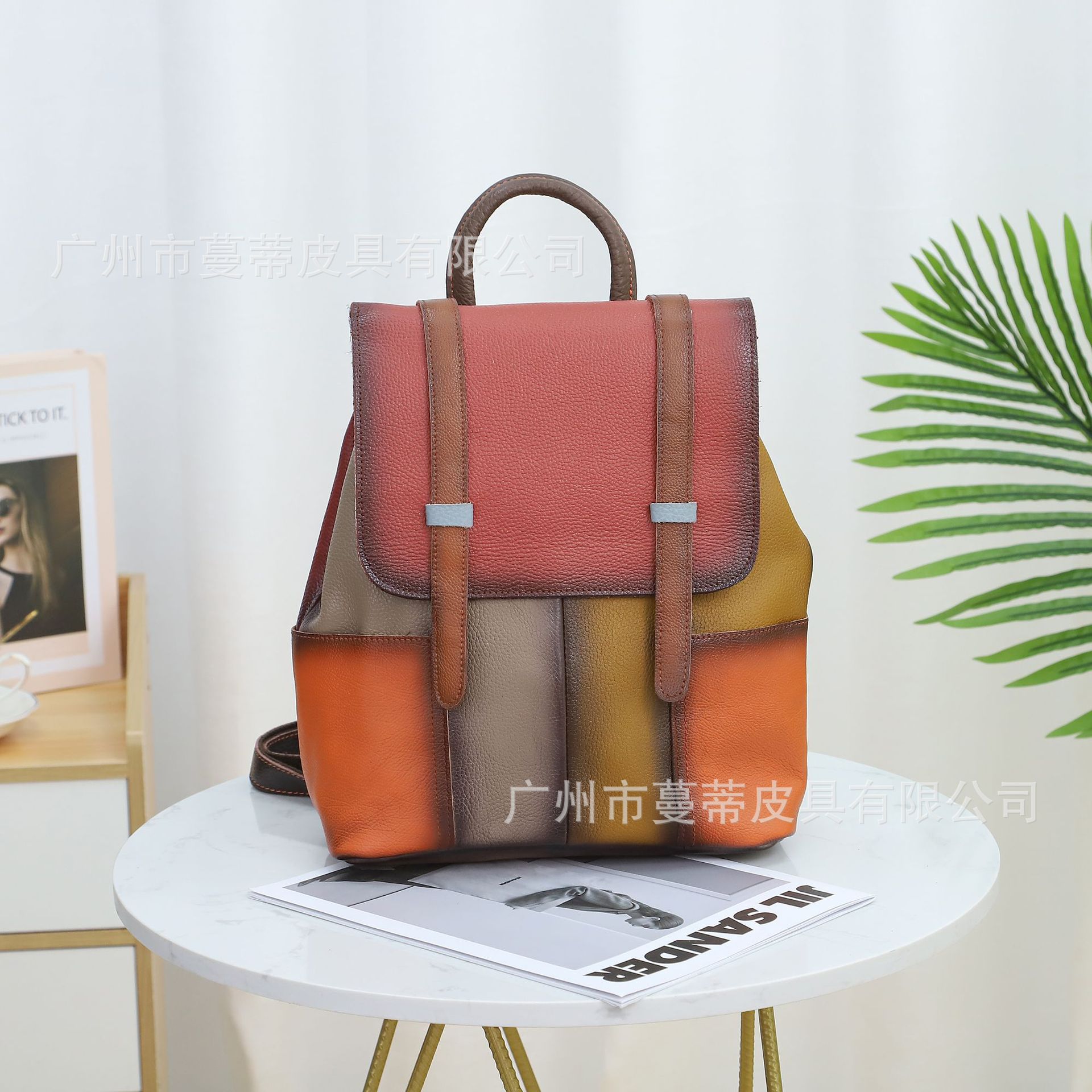 头层牛皮女式双肩包女士双肩背包复古风撞色彩色个性书包