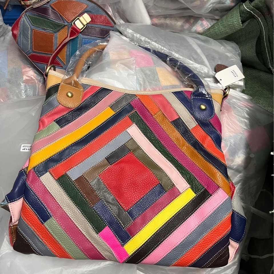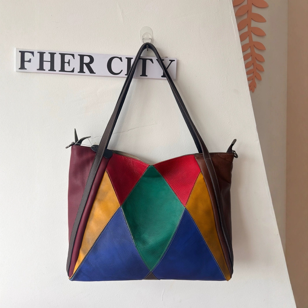 新款真皮女包复古擦色多彩拼接头层牛皮街头潮包单肩托特包