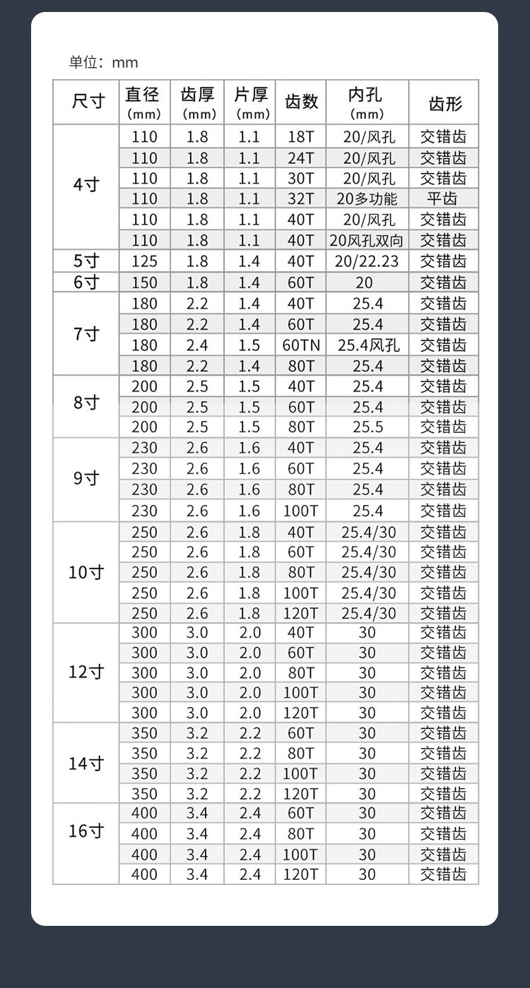 仕様 内装クラス4インチ30歯,内装クラス4インチ40歯,内装クラス4インチ40歯 (双方向カット),内装級5インチ40歯,内装級6インチ60歯,内装クラス7インチ60歯,内装級7インチ80歯,内装クラス9インチ60歯,内装クラス9インチ80歯,内装クラス10インチ60歯,内装クラス10インチ80歯,内装級12インチ80歯,内装級14インチ80歯,内装クラス16インチ80歯