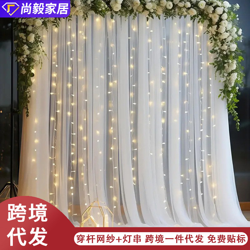 跨境带灯纱幔布幔穿杆婚礼派对现场布置装饰背景婚庆拱门网纱加灯