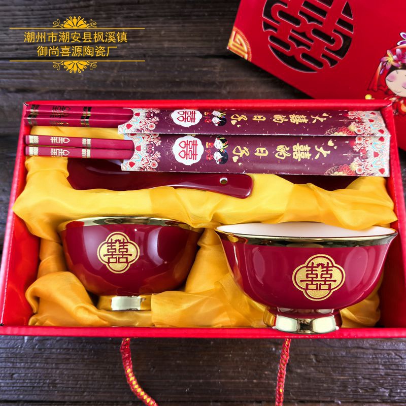 碗のギフトボックスの陶磁器の赤い碗の箸のセットの結婚のお返し用品の嫁入り用品の対碗の陶磁器の喜碗のお返しの結び