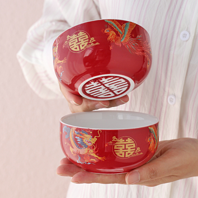 龙凤喜碗新人结婚碗筷套装一对红色面碗甜汤碗婚礼婚庆陪嫁夫妻碗