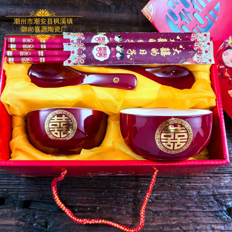 結婚食器と箸のスプーンセットの赤い食器と花嫁の付き添い用の双喜碗は新人の親友に新婚プレゼントを送ります。
