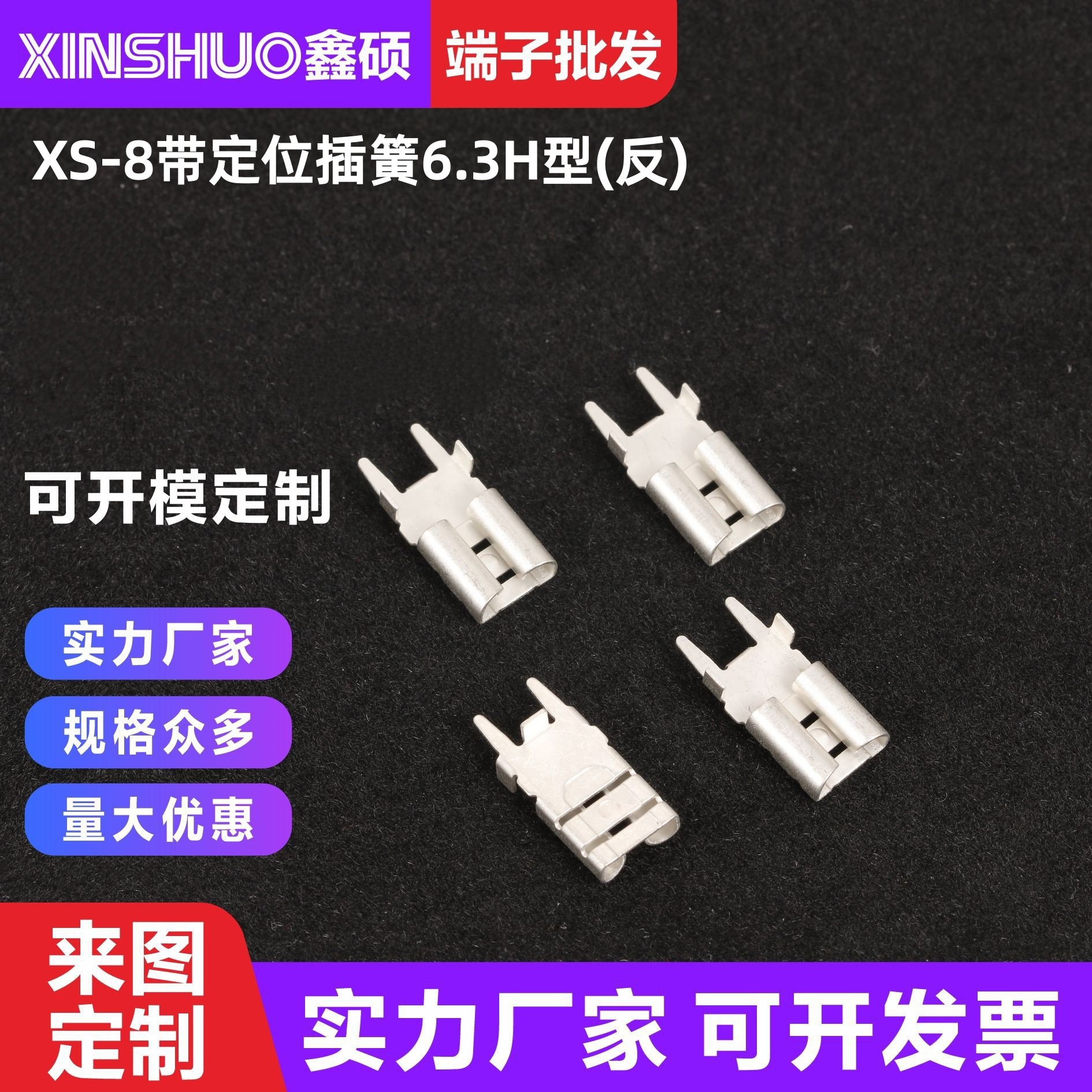 厂家直销 质量保证。 专业生产各类五金插片及五金端子、焊接插片、插簧、PC板接线端子、五金弹片、保险丝夹、保险丝座、五金冲压件等,并可根据客户要求按样品或图纸开模生产,量大可以免费开模。欢迎咨询洽谈。