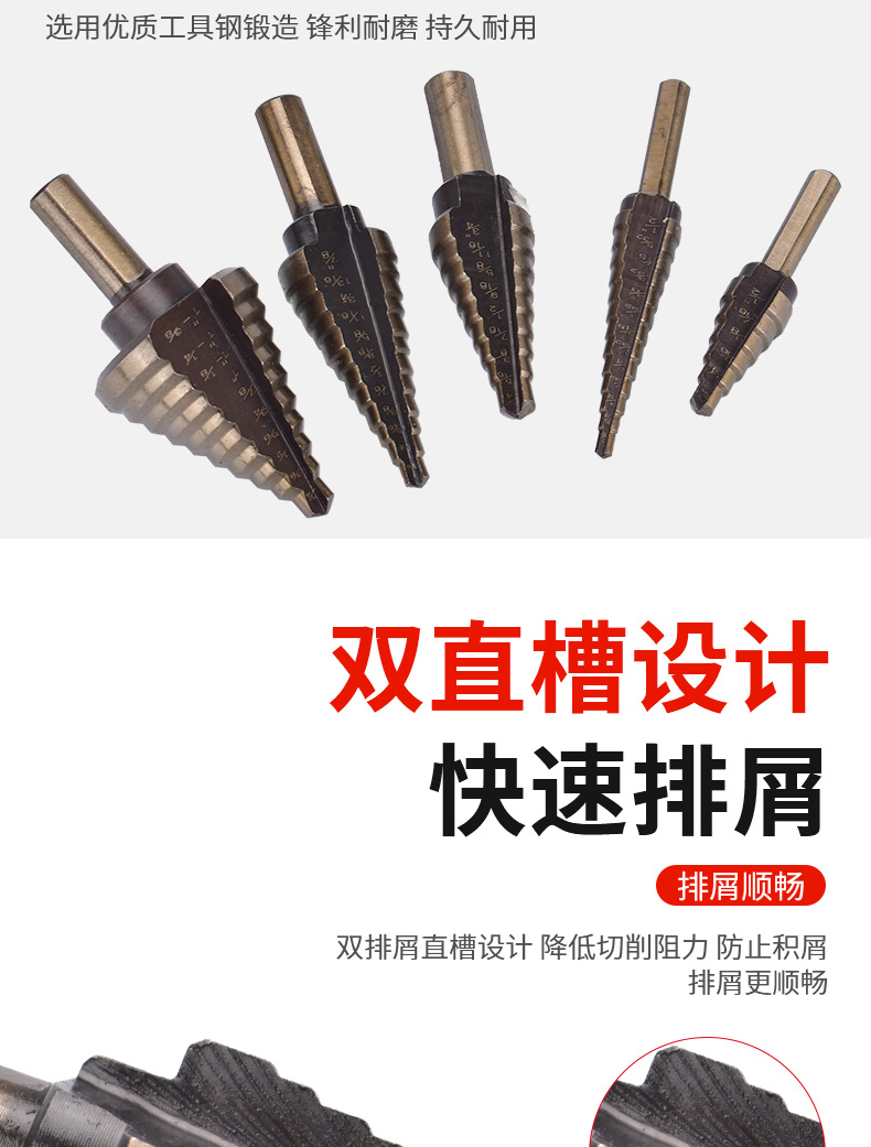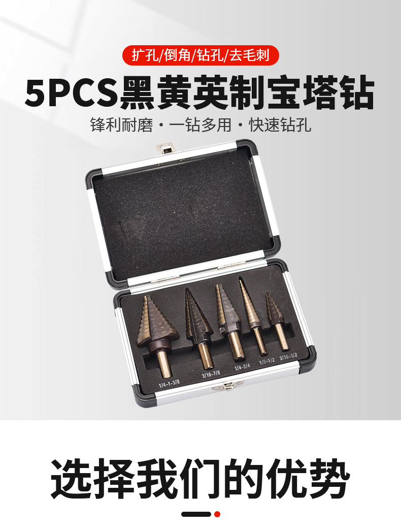 5PC 阶梯钻英制烤黄氮化阶梯钻三角柄直槽宝塔钻台阶钻头铝盒包装