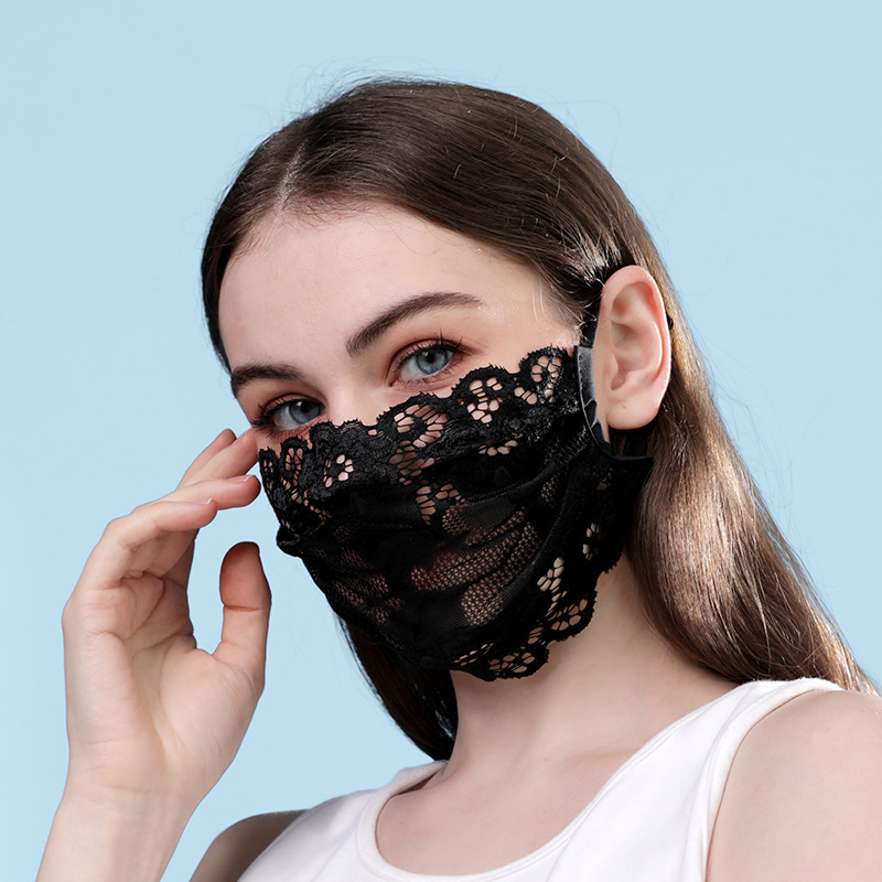レディース調節可能な耳ひもメッシュ薄いモデルマスク黒甘い花刺繍レース春夏マスク